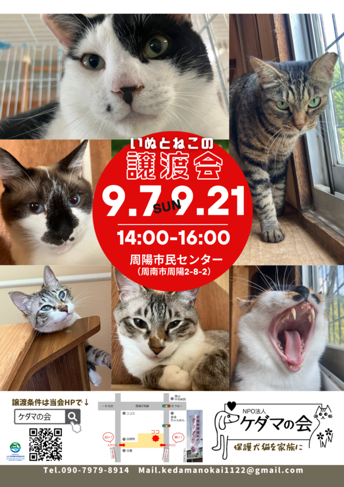 10月12日(日) 10月も開催時間は14:00-16:00です。10月はイベント参加のため、譲渡会は1回のみの予定です。(追記9/7)会場:周陽市民センター(周南市周陽2-8-2)