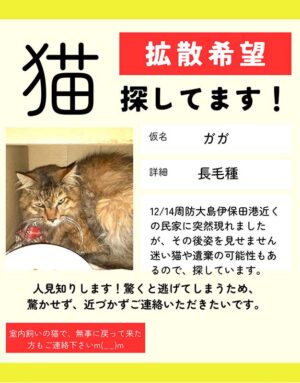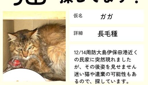 12/14日頃、周防大島の伊保田港付近の民家に突然現れた長毛の猫を探しています。