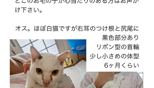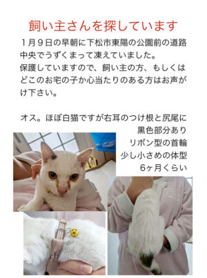 この猫さんの飼い主様、ご存知の方、お心当たりのある方、下記までご連絡をお願いいたします。