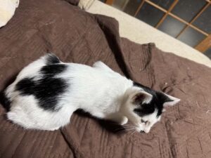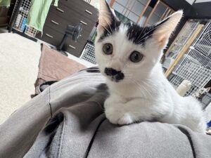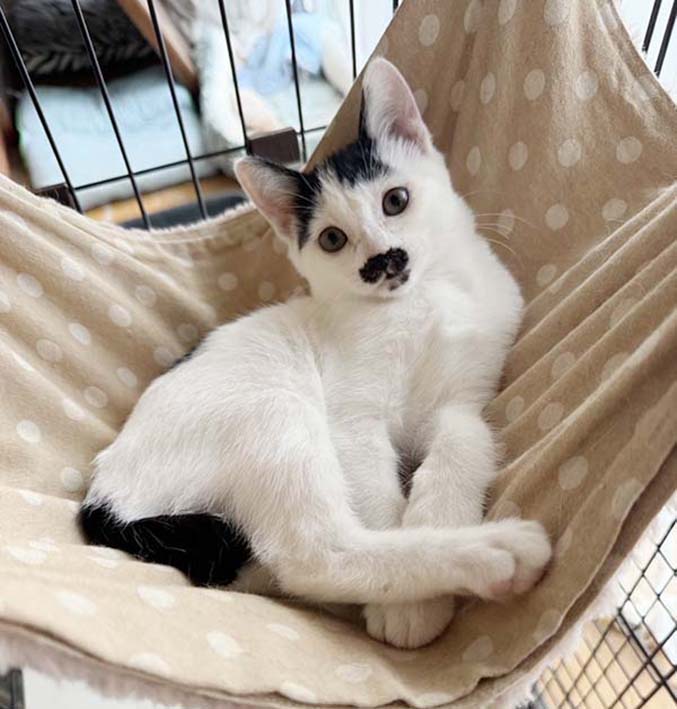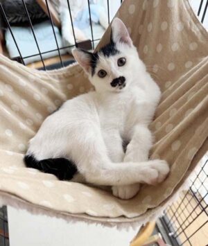 ・性格、特徴等 慎重な性格で、1人遊びする事が多いです。他の猫が側にくれば遊んでいます。人と犬猫に慣れています。寝る時やお留守番の時にはケージに入って生活しています。チョビ髭の様な模様があります。