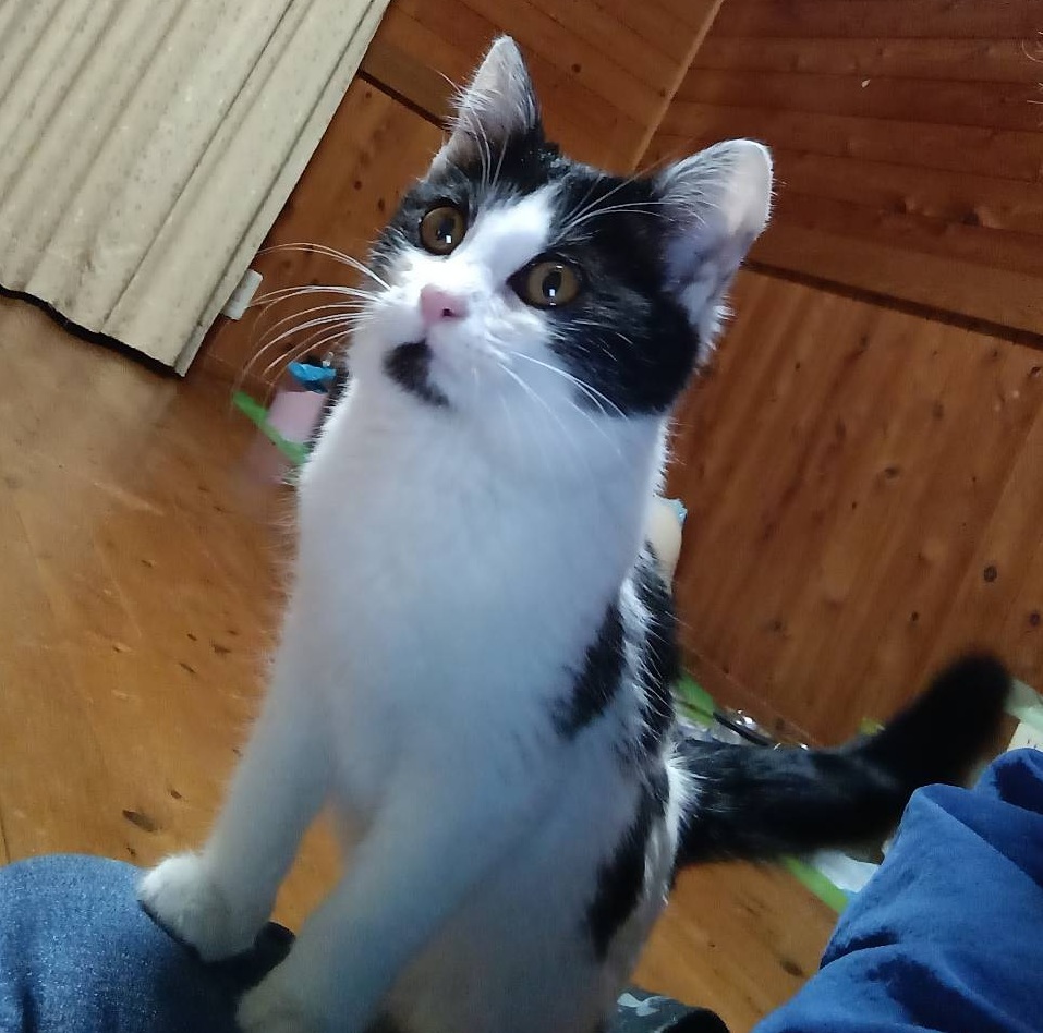 白黒のブチ模様がシャチのようなので、シャチ君とよんでいます。人間のひざの上にのってくれます。爪切りも嫌そうにしながらも、させてくれる猫さんです。鈴が入っている小さいボールや、小さいぬいぐるみなどのおもちゃがお気に入りです。