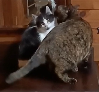 ↓先輩猫さんに、お顔をペロペロなめてもらっているところです。