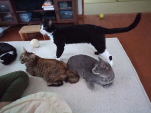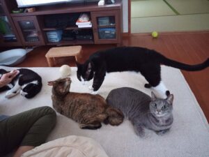 二人とも追いかけっこをしたり一緒に外を眺めたり、元気にしています。先住猫さん達ともすっかり打ち解け、みんな勢ぞろいでまったりする事も多くなりました。